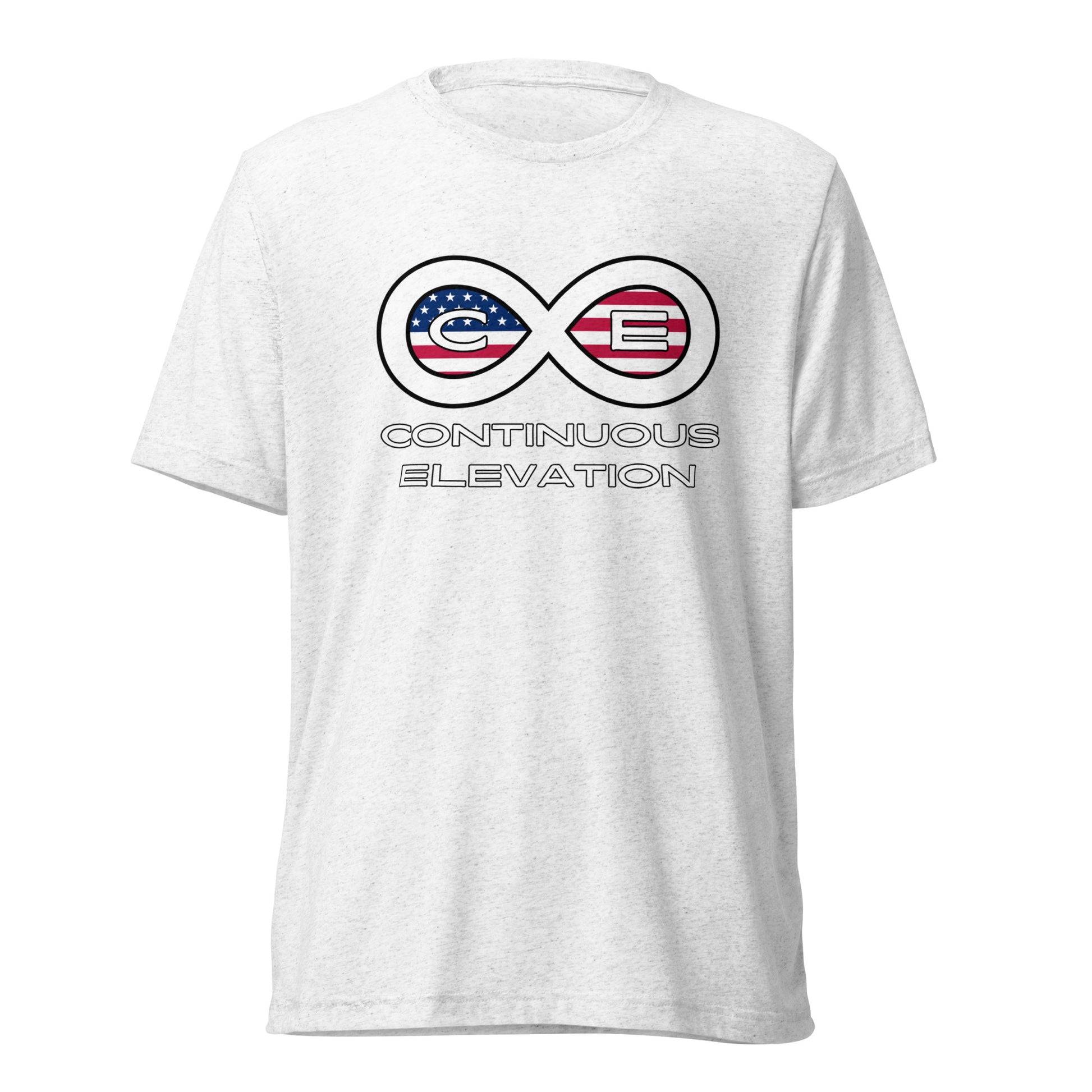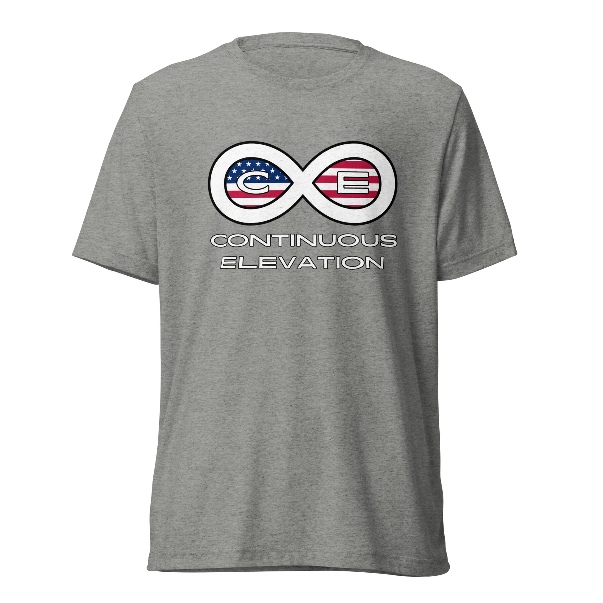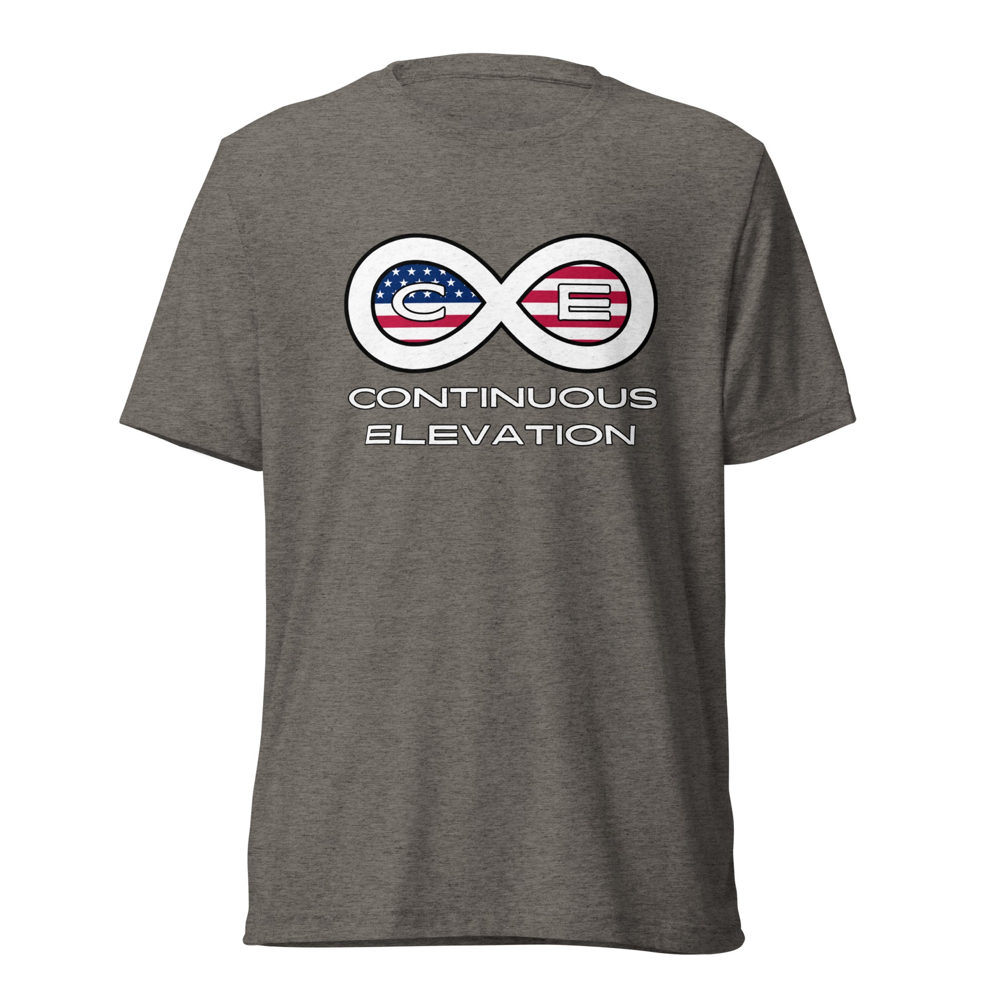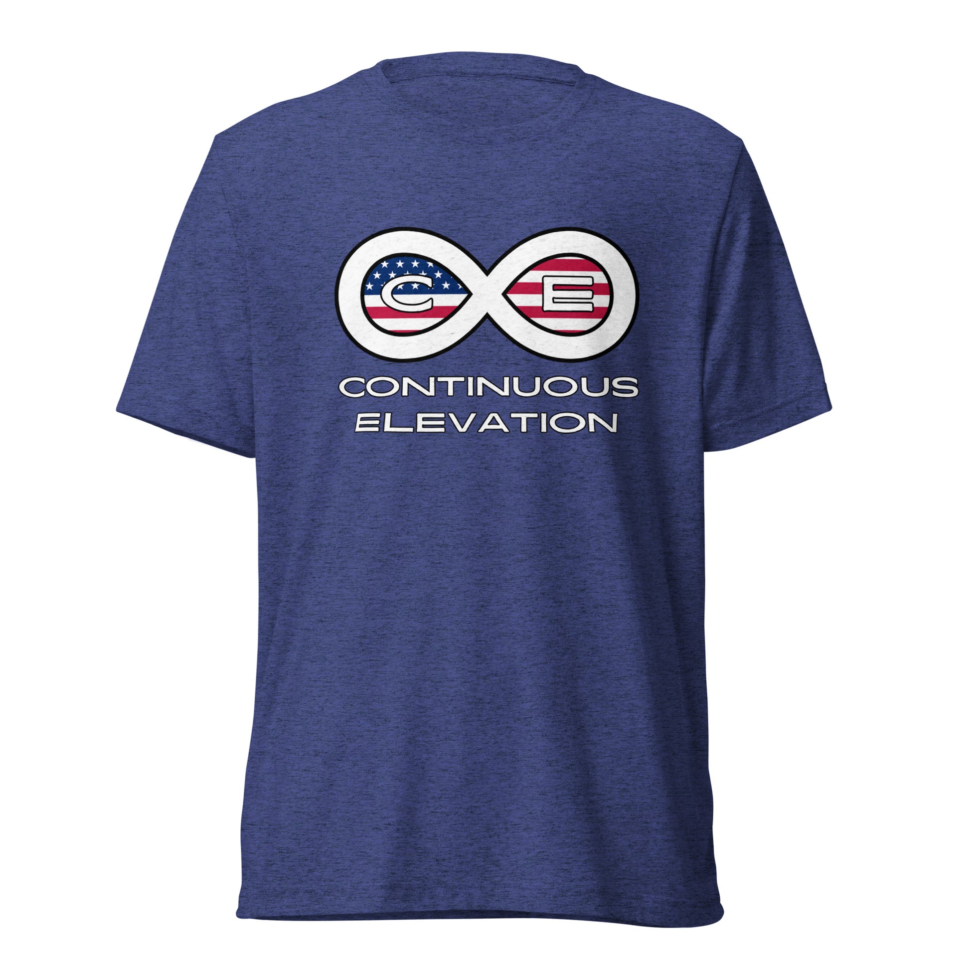 Wear your pride in the USA. This tri-blend tee features the signature Continuous Elevation logo with the United States flag backdrop on the front and back.