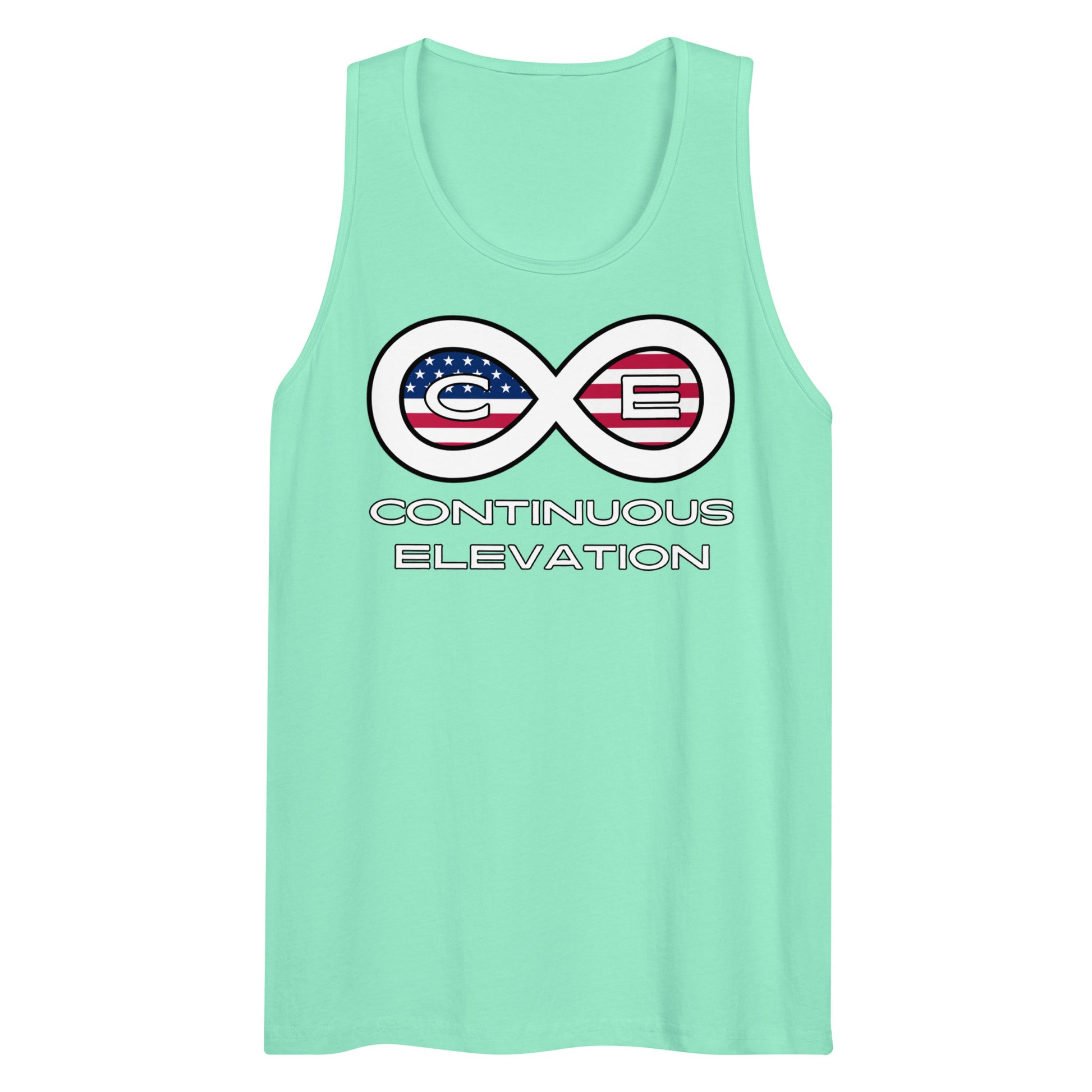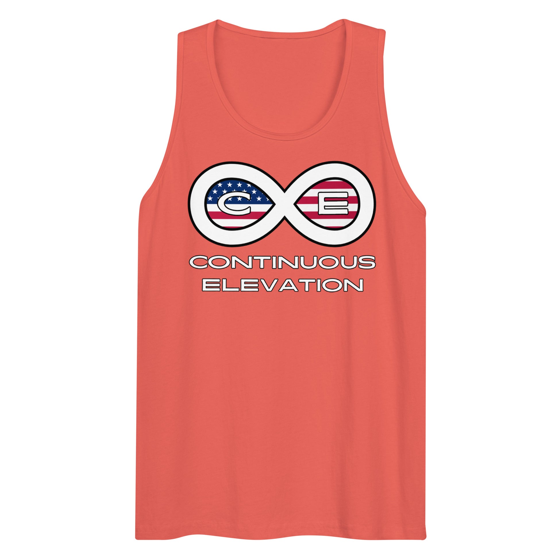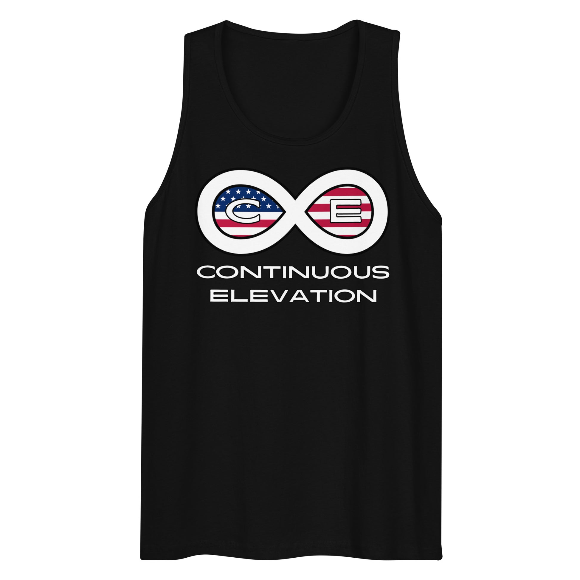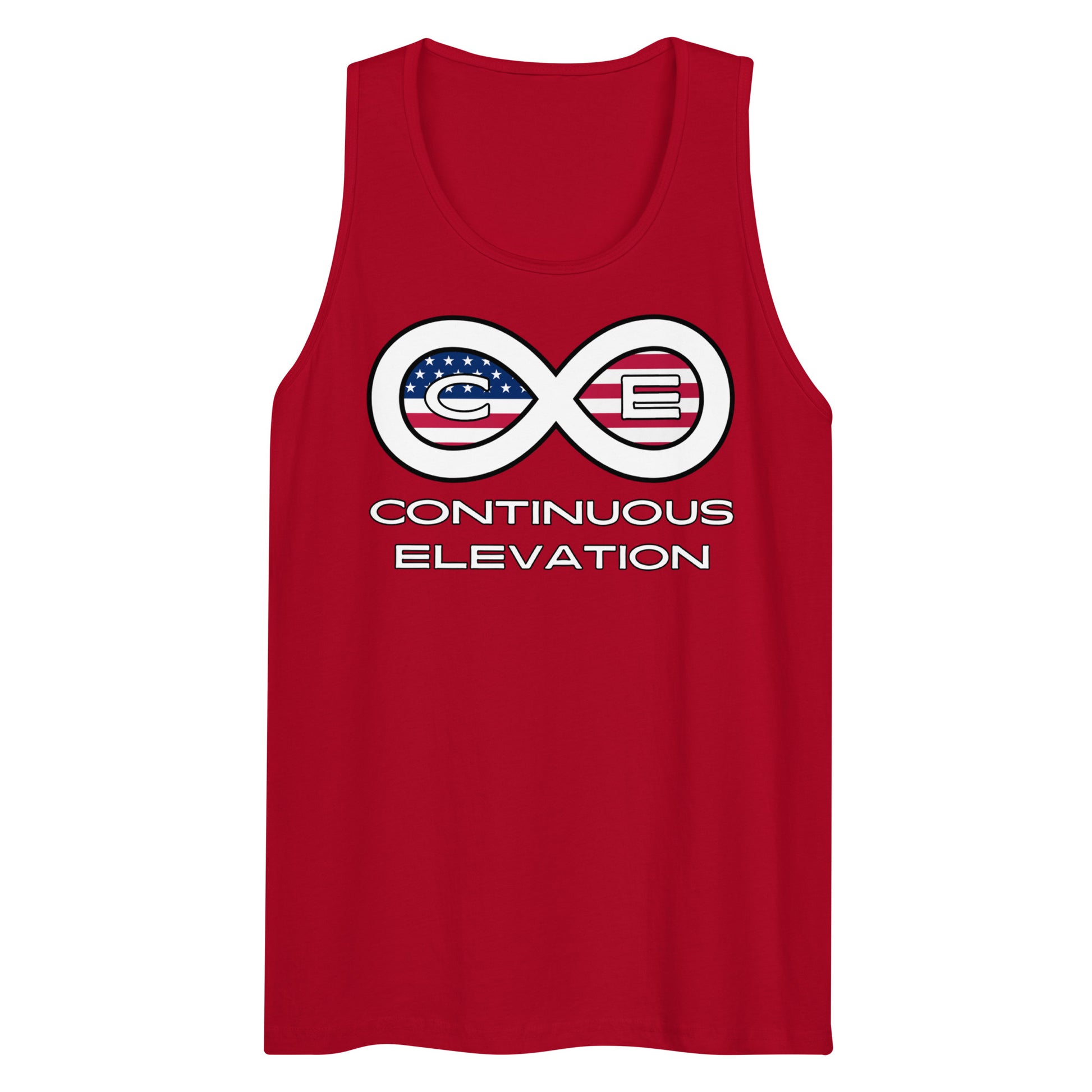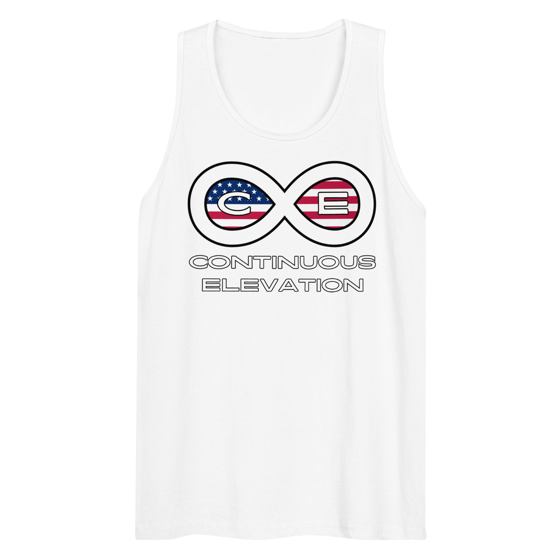 Wear your pride in the USA. This men's tank top features the signature Continuous Elevation logo with the United States flag backdrop on the front and back.